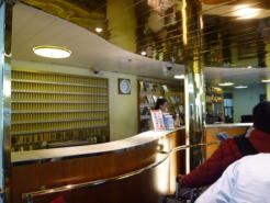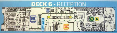 | ■メインデッキDECK6 フロント(レセプション)や主な施設が集まるフロアです。レストラン、カフェ、ナイトクラブ、ミニカジノ、免税店、ギフトショップがあります。 レストランはセルフサービスレストランです。一つ上のDECK7にセルフじゃないレストランがあります(こっちのほうが高め)。カフェバーではお酒やコーヒーが買えます。 ![]() |