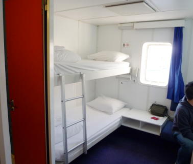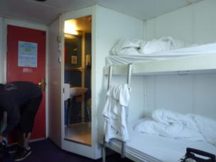 | ■キャビン 今回とった部屋は「2 beds outside (shower + wc)」 2人部屋個室、窓側、シャワートイレ付です。これより上はラグジュアリークラスになるので一般キャビンの中では一番いい部屋です。DECK7にありました。部屋番号は7172一番後方の端の部屋でした。部屋には2段ベッド。小ざっぱりとしたシーツ、ふかふかの枕。バスタオルもあります。電源もあり(C型) ![]() |