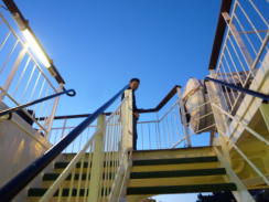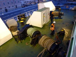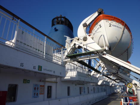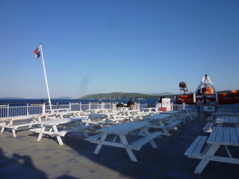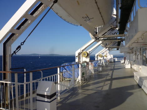 | DECK8のデッキプラン: 真ん中にエアシートルームがあります。隣にはお祈り用の小さなチャペルがありました。DECK8の右側「SUN DECK」は後方の外デッキになります。アンコーナ出航のときはここで港が遠ざかるのを眺めていました。メインの広いデッキです。カフェは閉まっていました。 ![]() DECK8「SUN DECK」外デッキ ![]() |